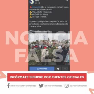 La Gobernación de Chimborazo informó a través de sus redes sociales que el medio de comunicación digital APR habría desinformado sobre el cierre de tres carreteras en el Ecuador. Publicaron una imagen con el logo del medio digital, la noticia y una leyenda en marca de agua: NOTICIA FALSA, cuando en realidad fue un dato oficial que se publicó a través del ECU 911 de Ambato.