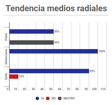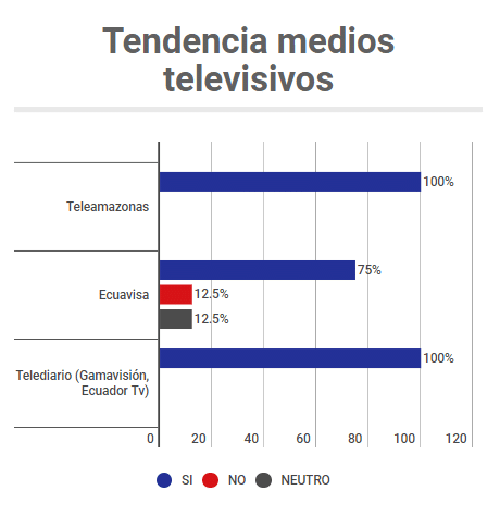 Examinado medio por medio, se puede ver que hay posicionamientos muy acentuados y mayoritarios por el Sí o por el No. En los polos están Teleamazonas con un 100% de espacios por el Sí y el diario El Tiempo de Cuenca (medio en manos del Estado) con el 100% de los espacios por el No (Ver el cuadro adjunto).
