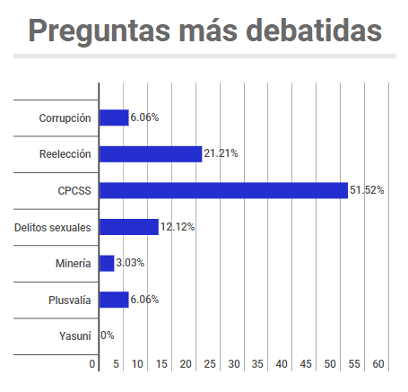 Cabe destacar que de las siete preguntas, propuestas por el Ejecutivo para este referéndum, de la que más se habló corresponde a la pregunta 3 sobre el cambio de quienes conforman el Consejo de Participación Ciudadana con el 52% (en 17 espacios de opinión). En esos 17 espacios hubo una tendencia del 59% al Sí, del 24% al neutro y del 18% al No.