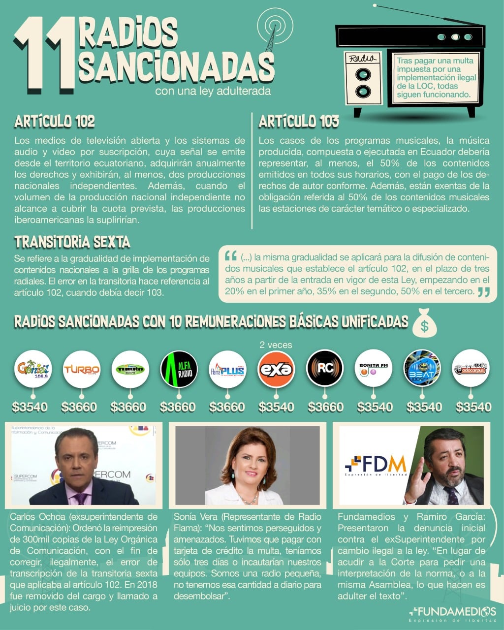 Durante 2015 y 2016, el exSuperintendente de Comunicación, Carlos Ochoa, se valió de la adulteración de la Ley Orgánica de Comunicación para sancionar a 11 radios a nivel nacional.