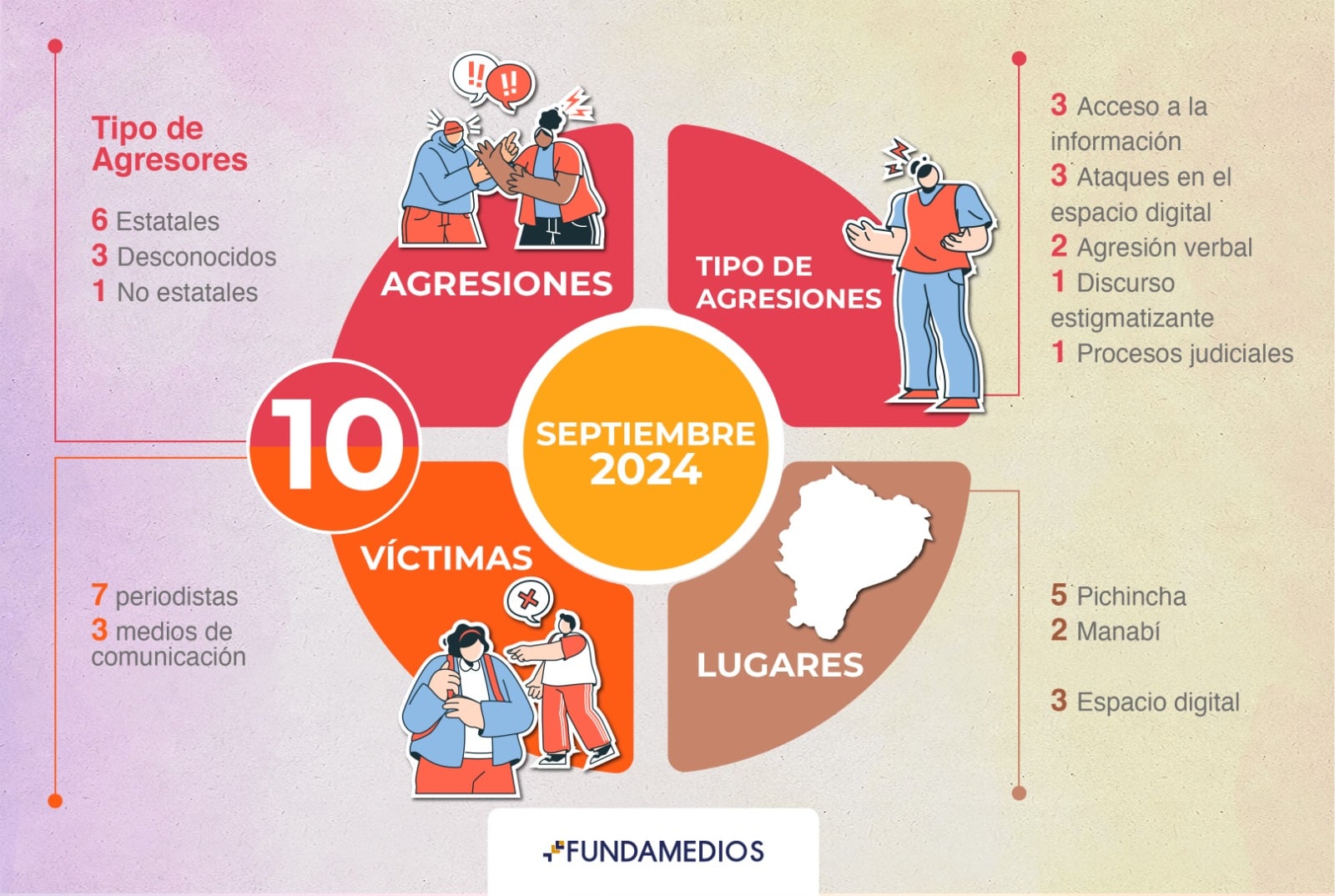 Ecuador, 01 de octubre de 2024.- Las agresiones contra la libertad de expresión y prensa mantienen un preocupante patrón de obstrucción al acceso a la información. En septiembre, Fundamedios registró 10 nuevos casos, elevando el total anual a 151 agresiones.