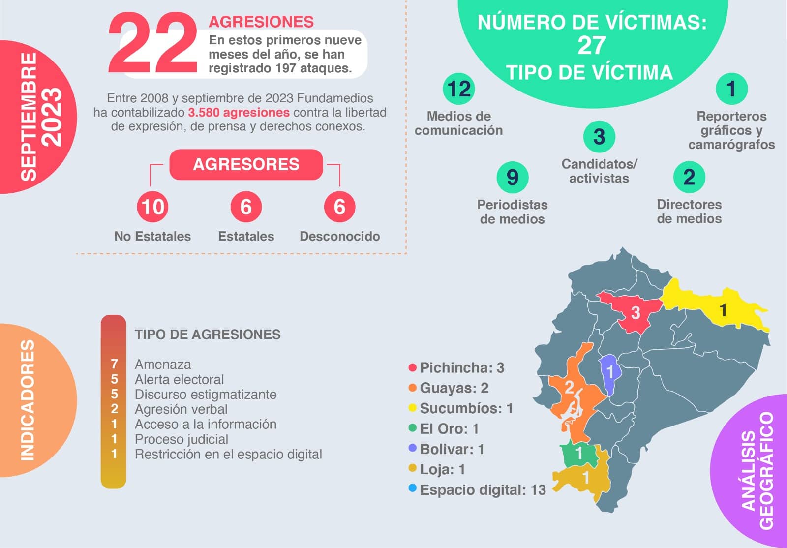 Ecuador, 30 de septiembre de 2023.- Este mes de septiembre, la libertad de expresión y de prensa fueron atacadas directamente y de forma violenta. En medio de la segunda vuelta electoral, los candidatos y movimientos y partidos políticos fueron, como en agosto, los principales victimarios contra la prensa. Este mes hemos registrado 22 tipos de agresiones, la misma cifra correspondiente al mes de agosto (en que lamentablemente se registró el magnicidio del periodista y candidato presidencial Fernando Villavicencio). Fundamedios contabiliza este 30 de septiembre 27 víctimas. En estos primeros nueve meses del año se han registrado 197 ataques contra la prensa. Entre 2007 y agosto de 2023 Fundamedios ha contabilizado 3.580 agresiones contra la libertad de expresión, de prensa y derechos conexos.