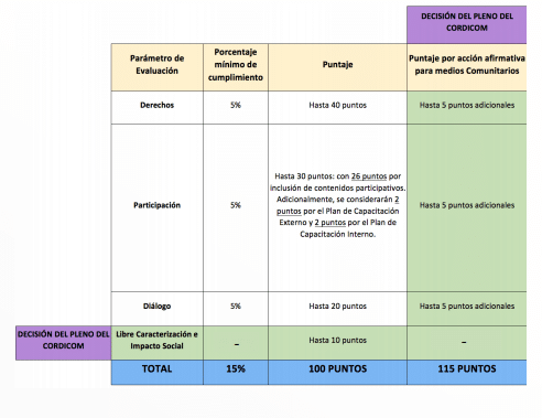 Adicionalmente, establece, entre otras cosas, que al proyecto comunicacional que cumpla con el 5% de tiempo aire en promoción de derechos; el 5% parámetro de participación y otro porcentaje igual en el parámetro de diálogo se le asignará 70 puntos y dos puntos adicionales para los proyectos que tengan un plan de capacitación interno y externo, en cada caso, lo que implica que toda la transmisión o parrilla esté a disposición del ejecutivo dependiendo el caso.