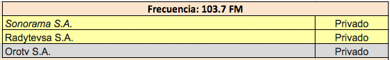 Otros casos son más sinuosos. En el caso de la frecuencia 103.7 FM, para Guayaquil y Quito, actualmente operada por Sonorama S.A., compiten el sistema de medios con sede en Machala, Orotv S.A. (relacionada con Caravana TV) y una empresa constituida apenas el 01 de junio de 2016, llamada Radytevsa S.A. Los accionistas de esta empresa son Carlos César Cañola Ordoñez y Kenia Karina Parra Martinez. Carlos Cañola aparece como gerente general de esta empresa, pero también consta como gerente general de SUMIL C.A. empresa que se dedica a la comercialización de material militar.