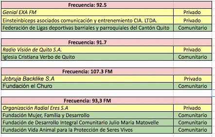 Las desventajas para los privados se consagró en el texto de la misma LOC, dónde se impuso un reparto de frecuencias en tercios rígidos. Los medios privados deben ser reducidos al 33% y los comunitarios deben llegar al 34%. Para entender qué significa esto, tomemos el caso de la radio FM de Pichincha.