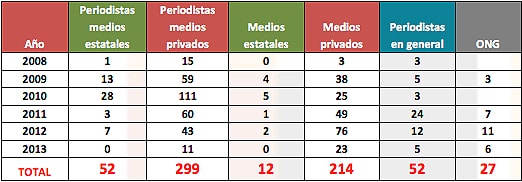 Over the last five years (2008-2013), Fundamedios has counted 657 aggressions against freedom of expression with a total of 699 victims.This long list includes journalists, communicators and media outlets, both private and managed by the State (public, governmental and seized).